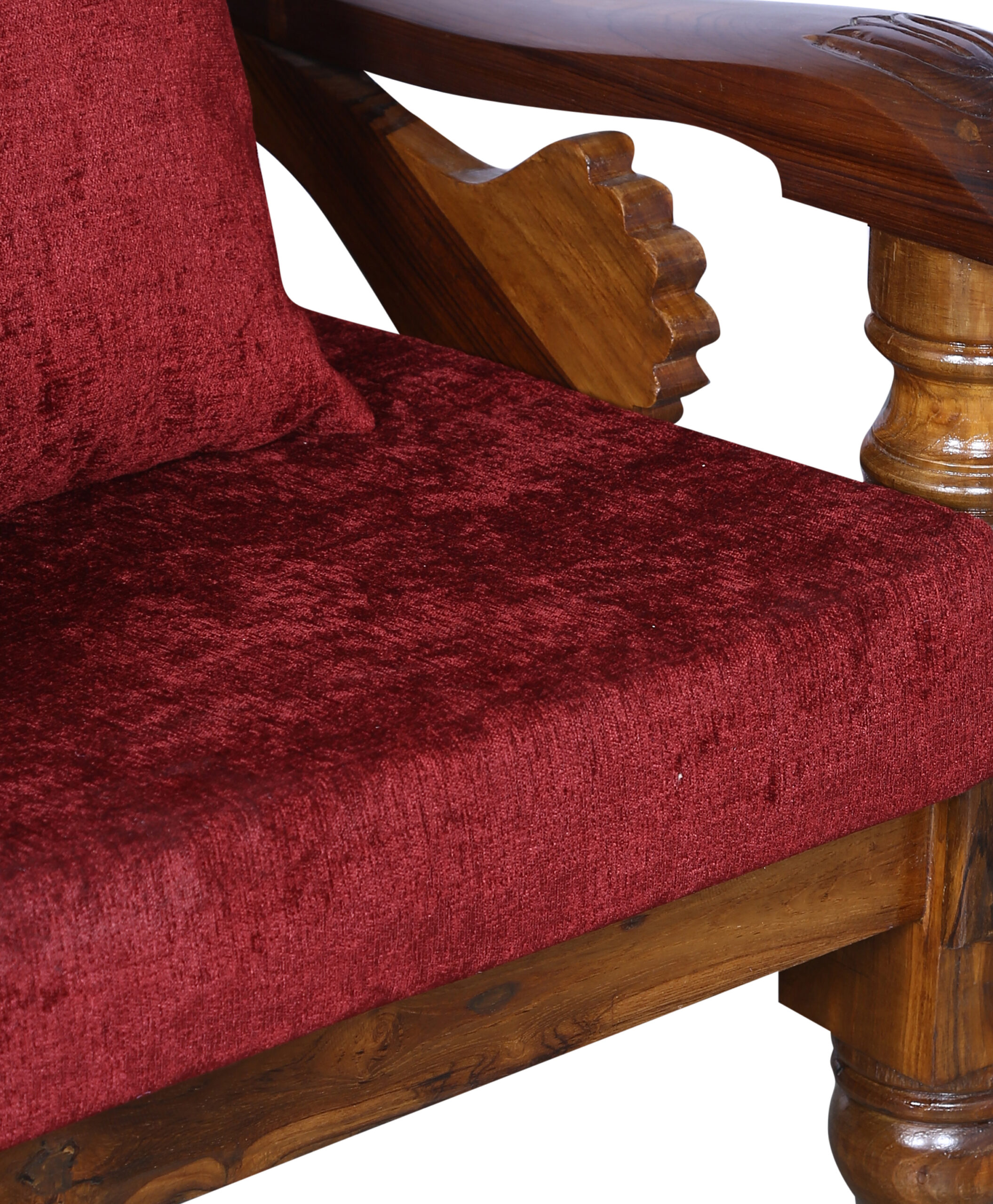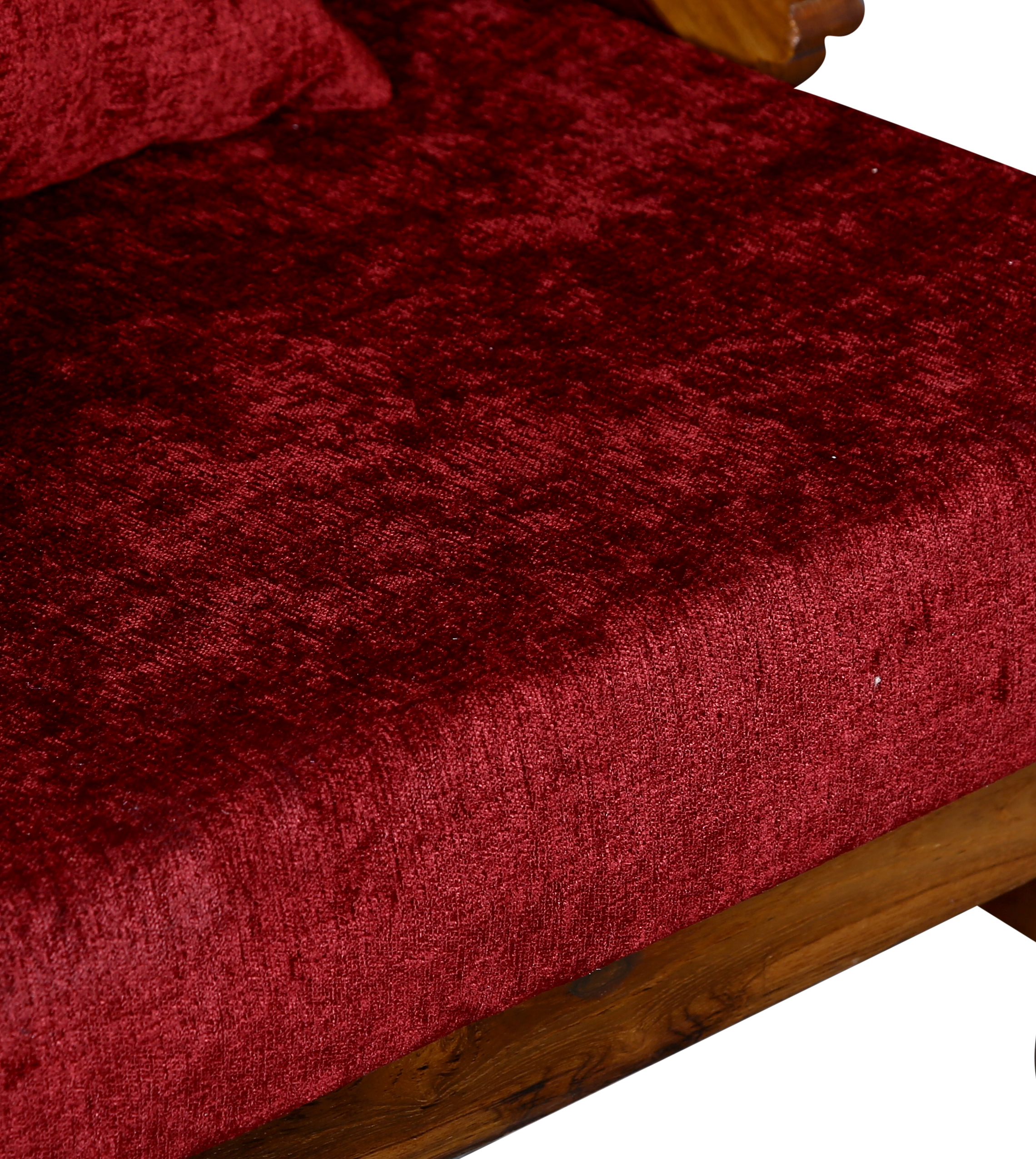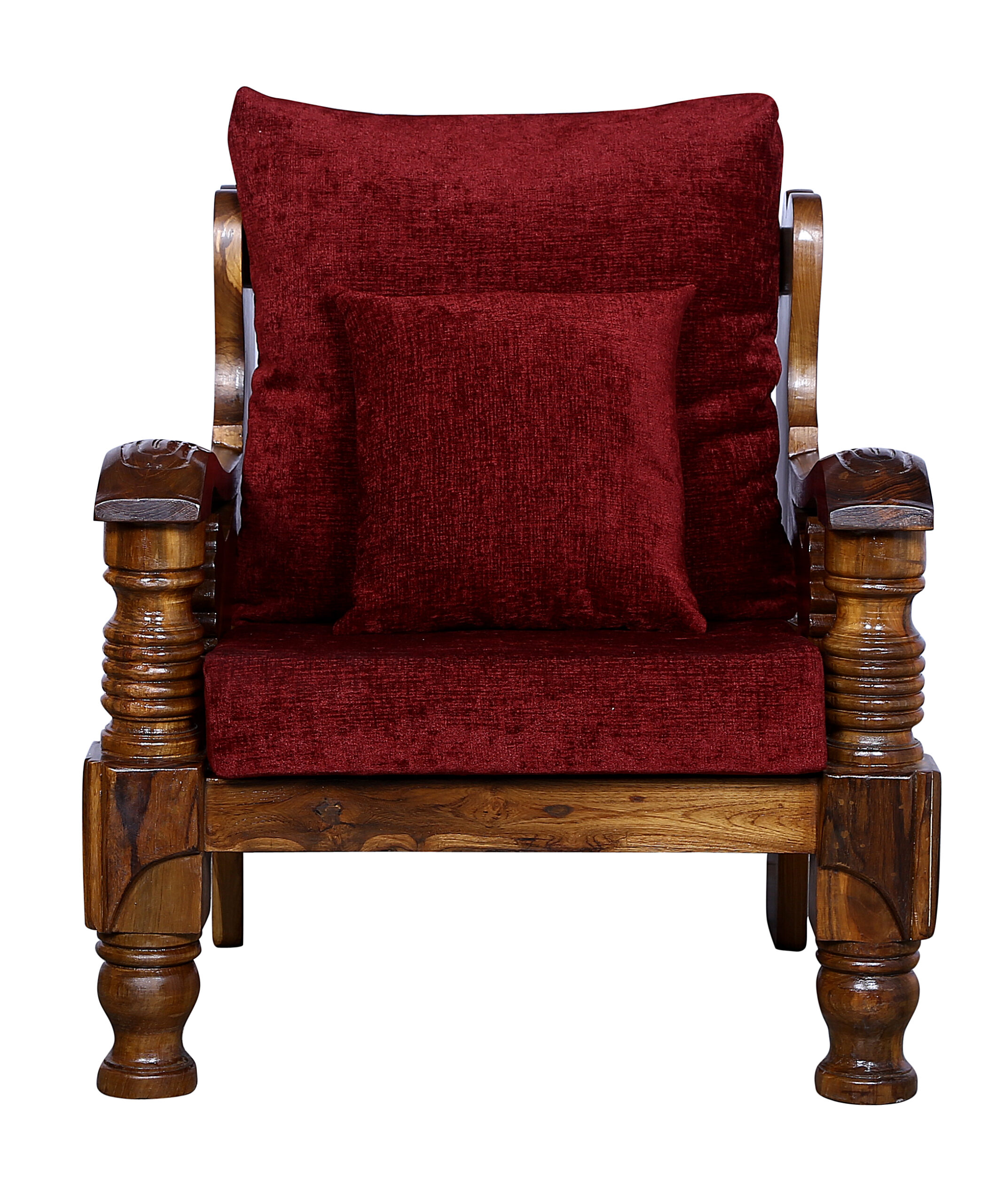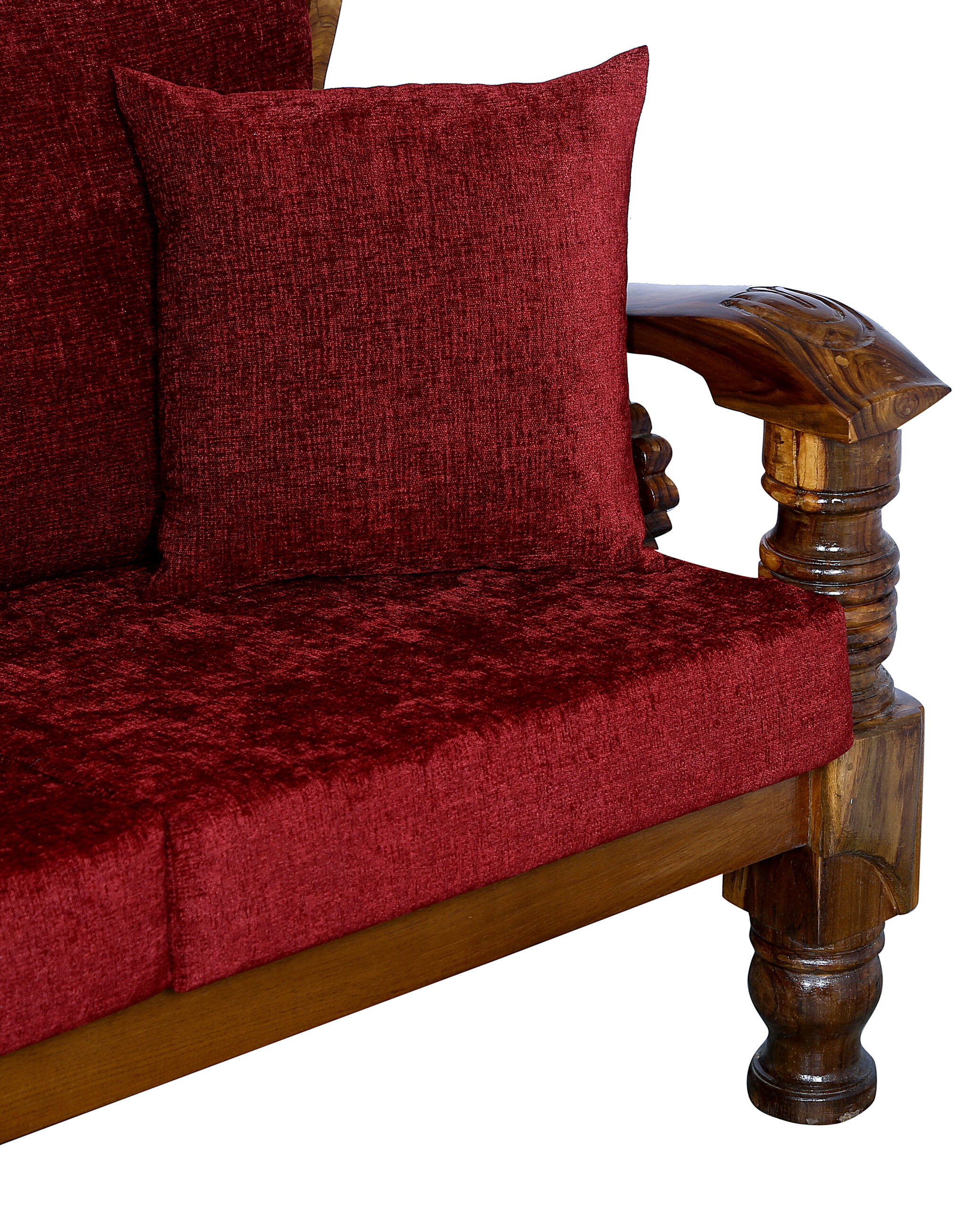 - Color: Wooden Brown |Cushion:Maroon| Pillows : Maroon
